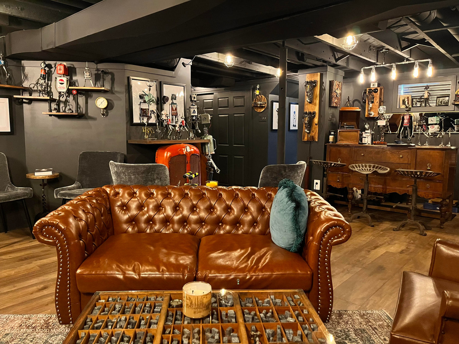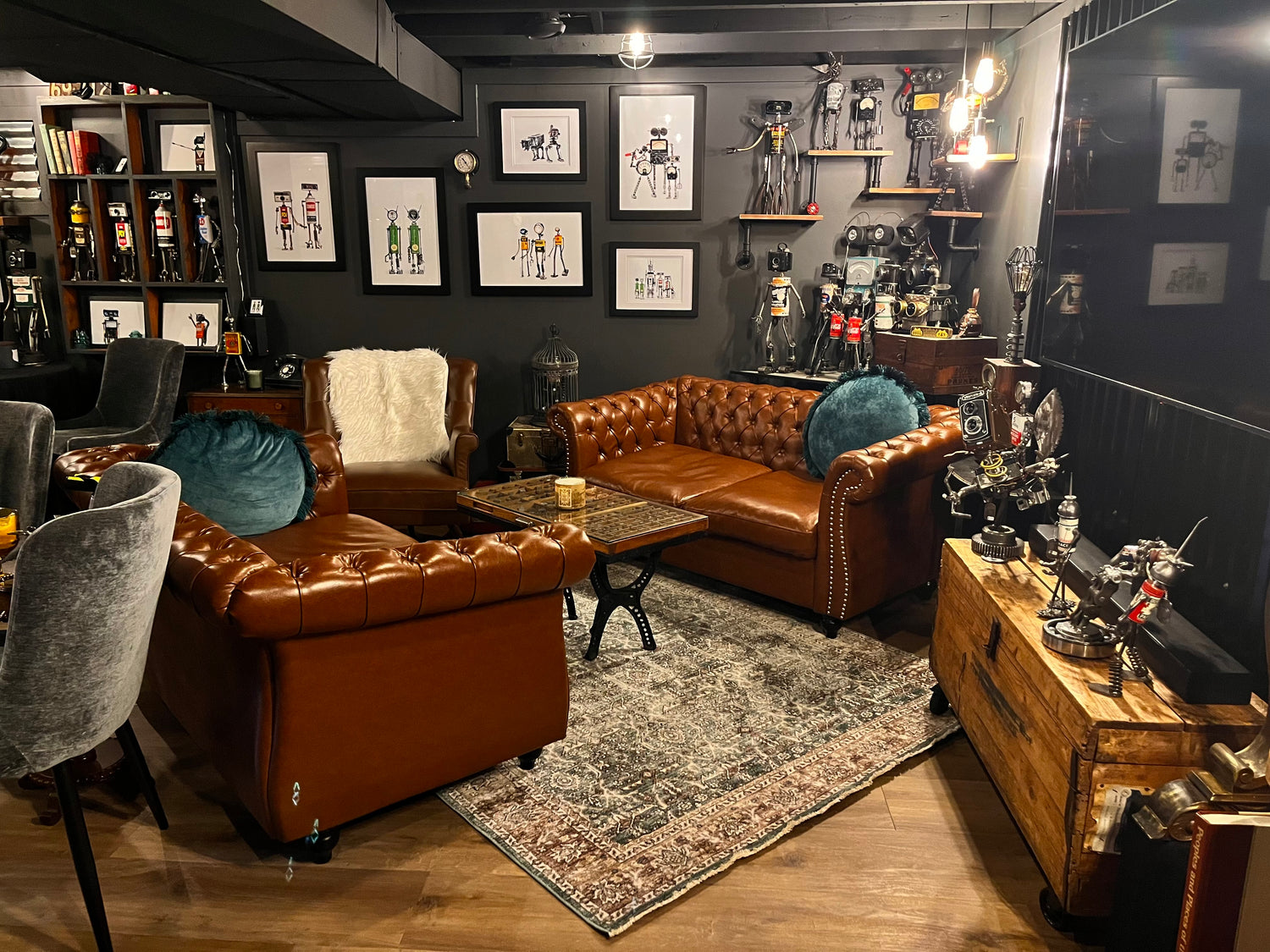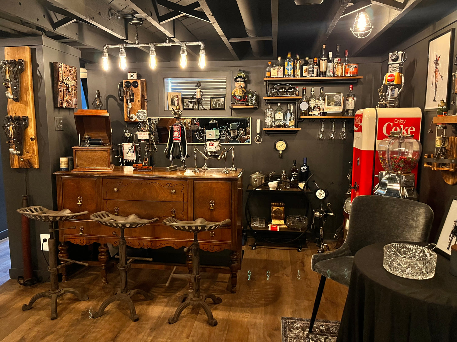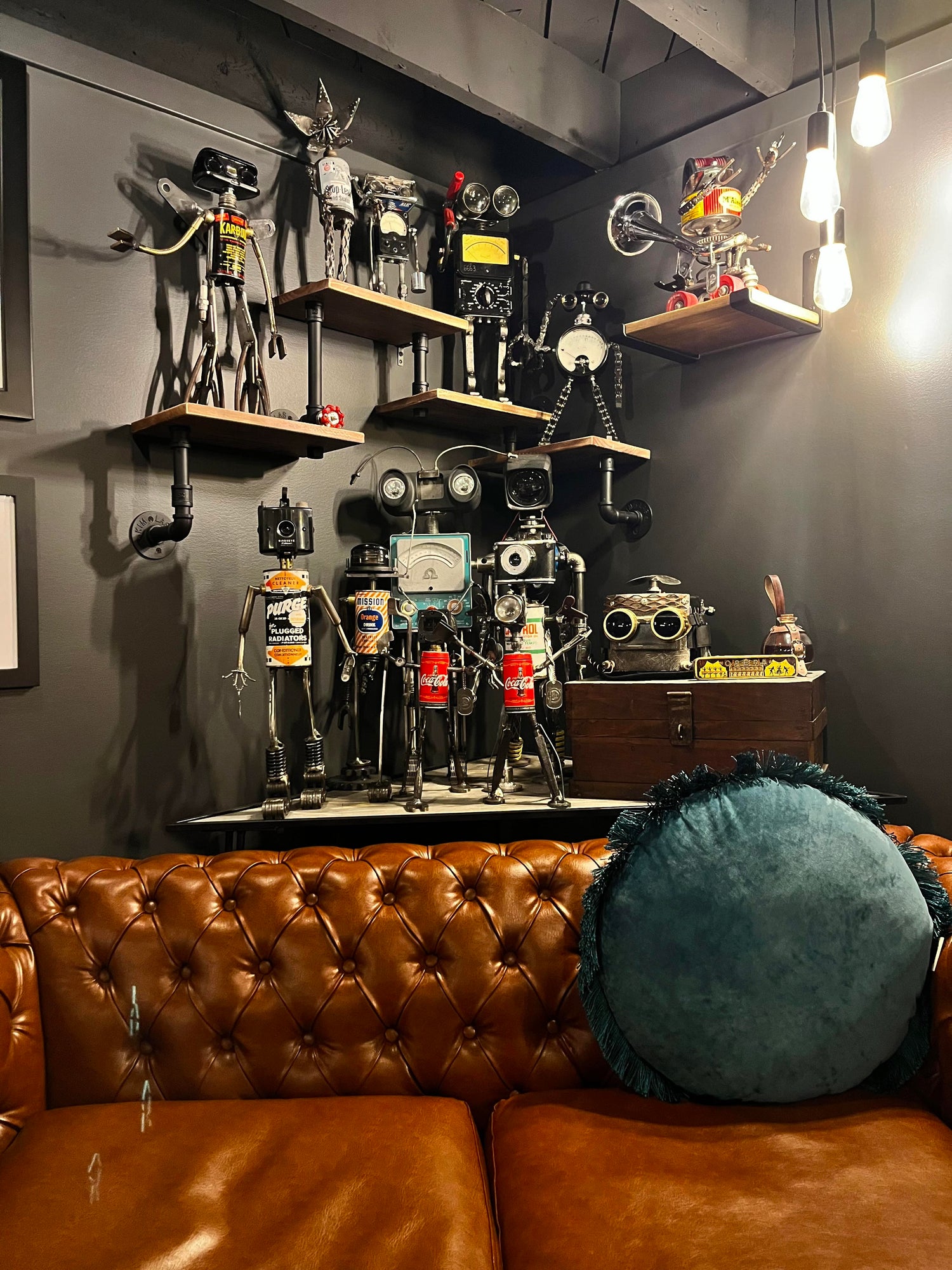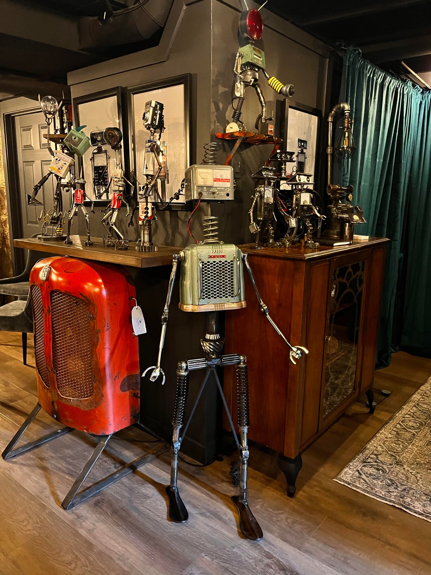 Step into our hidden gem. A speakeasy-style gallery where industrial artistry meets vintage charm. Nestled within our home studio, this immersive space showcases our one-of-a-kind robot sculptures crafted from vintage tins and reclaimed metal. With steampunk-inspired decor and stories behind every creation, the gallery invites you to experience art in a whole new way. Join us for a guided tour to explore the craftsmanship, creativity, and whimsy of Mad Mike Studio 68. Booking is available by appointment. Discover a place where imagination sparks and metal comes to life.