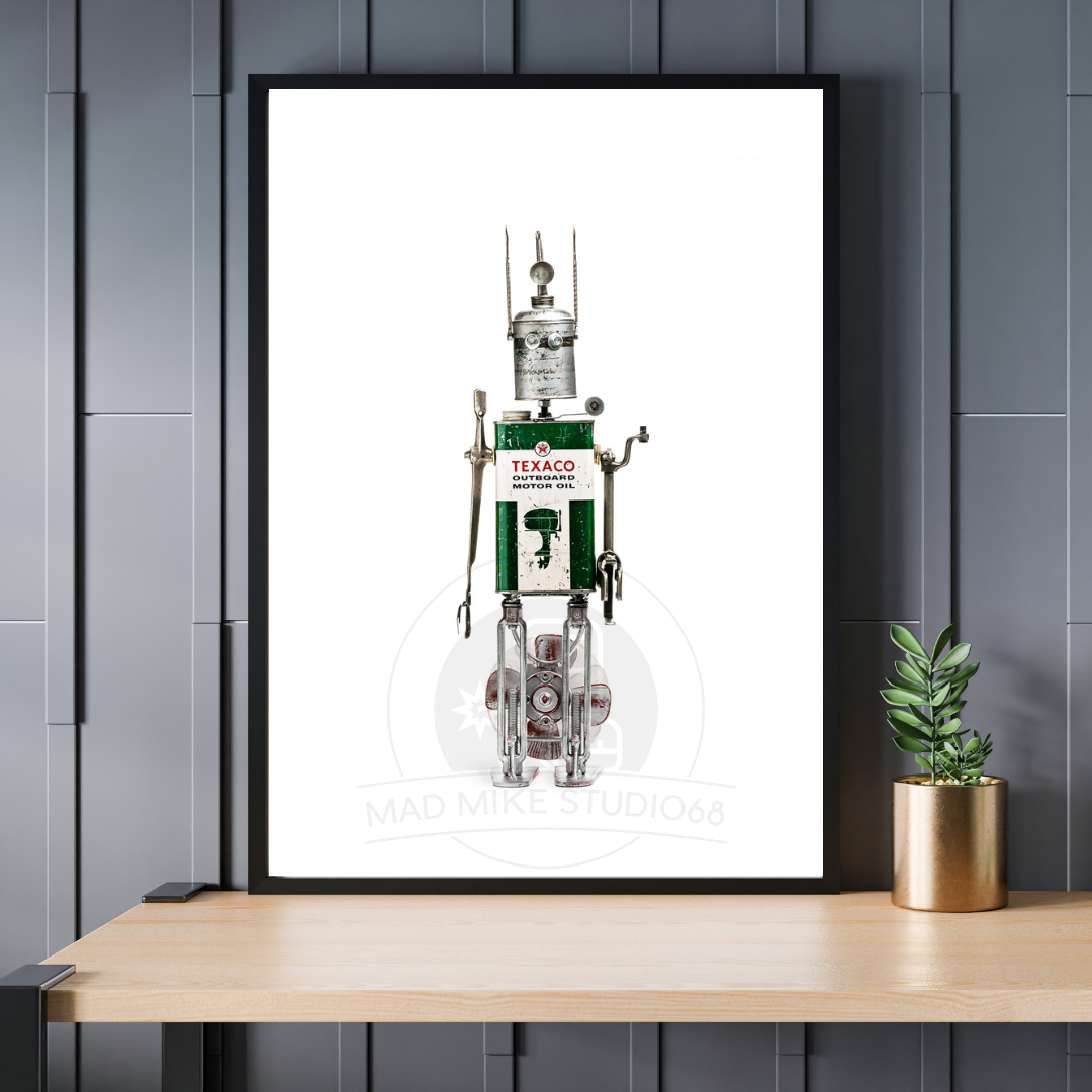 This professionally photographed high quality art print of one of Mad Mike Studio68's actual robot sculptures is printed on Epson Ultra Premium Photo paper. It will arrive signed by the artist and will be free of the watermark you see in this image. Mounting hardware or frame must be purchased separately. You will receive the 8.5 x 11" art print and artist bio carefully packaged with a cardboard backing and protected by a clear, moisture resistant, cellophane bag and rigid outer packaging. The 13 x 19" print and artist bio will arrive carefully packaged in a cardboard mailing tube.